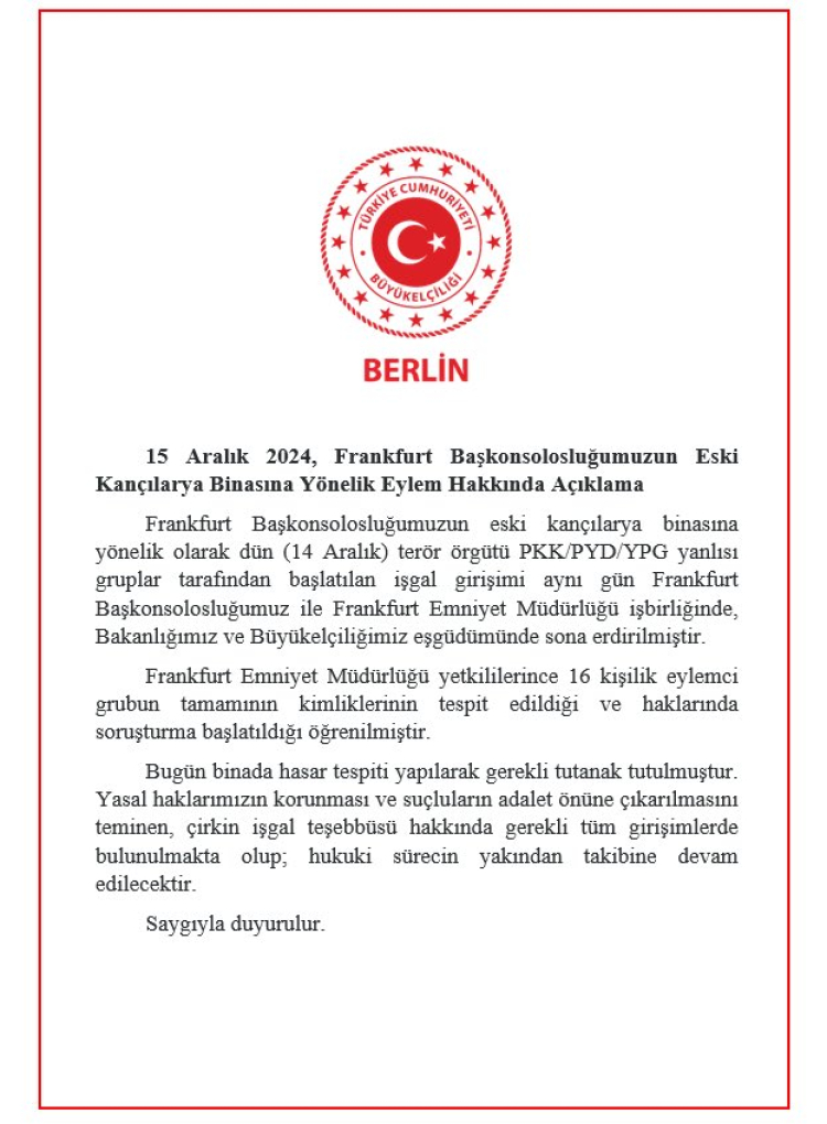ANKARA (İGFA) - Türkiye Cumhuriyeti Berlin Büyükelçiliği'nden yapılan açıklamada, Frankfurt Başkonsolosluğu'nun eski kançılarya binasına yönelik olarak 14 Aralık Pazar günü terör örgütü PKK/PYD/YPG yanlısı gruplar tarafından başlatılan işgal girişiminin aynı gün Frankfurt Başkonsolosluğu ile Frankfurt Emniyet Müdürlüğü işbirliğinde, Bakanlık ve Büyükelçilik eşgüdümünde sona erdirildiği açıklandı.