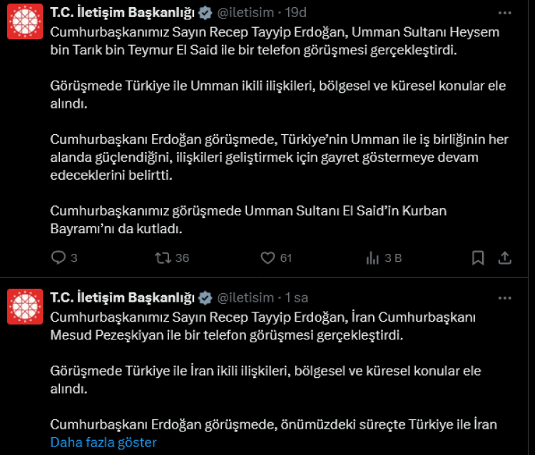 ANKARA (İGFA) - İletişim Başkanlığı'ndan yapılan paylaşımlara göre, İran ve Umman liderleriyle yapılan iki ayrı görüşmede, Türkiye’nin bölgesel diplomasi ve iş birliğini güçlendirme hedefi yansıtılırken, Kurban Bayramı vesilesiyle liderler arasında iyi niyet mesajları da paylaşıldı.