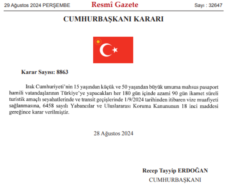 ANKARA (İGFA) - Irak Cumhuriyeti’nin 15 Yaşından Küçük ve 50 Yaşından Büyük Umuma Mahsus Pasaport Hamili Vatandaşlarının Türkiye’ye Yapacakları Her 180 Gün İçinde Azami 90 Gün İkamet Süreli Turistik Amaçlı Seyahatlerinde ve Transit Geçişlerinde 1/9/2024 Tarihinden İtibaren Vize Muafiyeti Sağlanması Hakkındaki Cumhurbaşkanı kararı bugünkü Resmi Gazete'de yayımlandı.