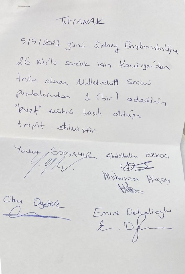 Hatırlanacağı gibi, CHP'den yapılan paylaşımda yurt dışı seçimlerde Avustralya Sydney'de açılmamış işaretli oy pusulaları çıktığı belirtilmiş ve "Avustralya Sidney 2-G sandığında, açılmamış oy pusulasında AKP’ye basılan mühür çıktı. Tutanak tutuldu. Partimiz adına Yurt Dışı İlçe Seçim Kurulu’na suç duyurusunda bulunuyoruz. Takipçisi olacağız" denilmişti.