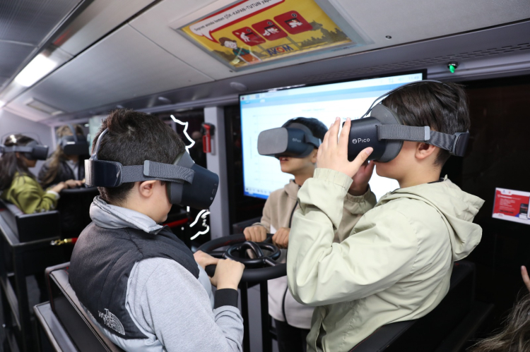 Eğitim sonrası öğrenciler, sanal gerçeklik teknolojisiyle donatılmış özel bir otobüste uygulamalı deneyim yaşıyor. VR Deprem Deneyim Simülatörü, Hareketli Eğitici VR Sinema ve Yangın Söndürme Simülatörü ile çocuklar, deprem ve yangın anında doğru davranışları öğreniyor. 3D animasyonlarla depremin etkilerini hisseden öğrenciler, teorik bilgilerini pratikle pekiştiriyor.