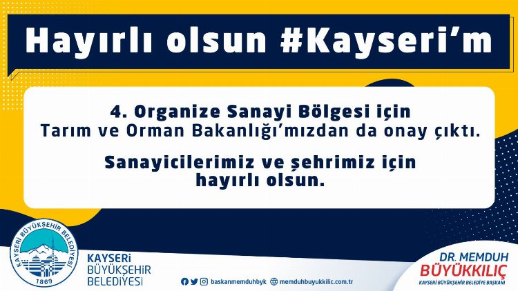 Kayseri Büyükşehir Belediye Başkanı Dr. Memduh Büyükkılıç, ticaretin, endüstrinin ve sanayinin merkezi Kayseri’ye bir müjde paylaşarak, “4’üncü Organize Sanayi Bölgesi için Tarım ve Orman Bakanlığı’mızdan da onay çıktı. Şehrimize ve sanayicimize hayırlı olsun” dedi.