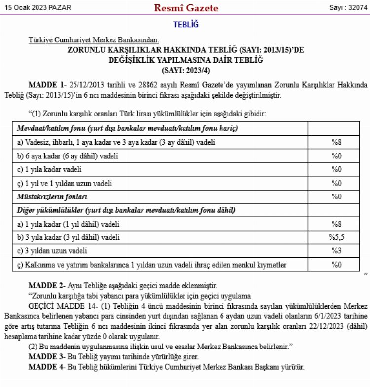 6 ay, 1 yıl ya da daha uzun vadeli hesaplar için zorunlu karşılık oranı yüzde 0 olarak belirlendi.