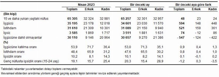 İşgücü 2023 yılı Nisan ayında bir önceki aya göre 594 bin kişi artarak 35 milyon 195 bin kişi, işgücüne katılma oranı ise 0,9 puan artarak yüzde 53,9 olarak gerçekleşti. İşgücüne katılma oranı erkeklerde yüzde 71,7 iken kadınlarda ise yüzde 36,4 oldu.