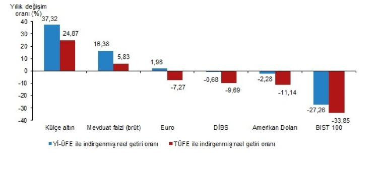 Yıllık bazda külçe altın, Yİ-ÜFE ile yüzde 37,32, TÜFE ile yüzde 24,87 reel getiriyle en yüksek performansı gösterdi. Yİ-ÜFE ile indirgendiğinde mevduat faizi yüzde 16,38, Euro yüzde 1,98 getiri sağlarken; DİBS yüzde 0,68, Amerikan Doları yüzde 2,28 ve BIST 100 endeksi yüzde 27,26 kayıp yaşattı. TÜFE ile indirgendiğinde ise mevduat faizi yüzde 5,83 getiri sunarken; Euro yüzde 7,27, DİBS yüzde 9,69, Amerikan Doları yüzde 11,14 ve BIST 100 endeksi yüzde 33,85 kayıpla yatırımcısını üzdü.