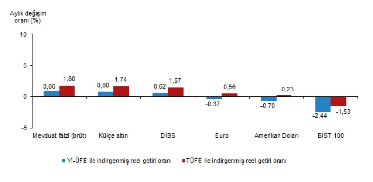 Yİ-ÜFE ile indirgendiğinde külçe altın yüzde 0,80, Devlet İç Borçlanma Senetleri (DİBS) yüzde 0,62 reel getiri sağlarken; Euro yüzde 0,37, Amerikan Doları yüzde 0,70 ve BIST 100 endeksi yüzde 2,44 kayıp yaşattı. TÜFE ile indirgendiğinde ise külçe altın yüzde 1,74, DİBS yüzde 1,57, Euro yüzde 0,56 ve Amerikan Doları yüzde 0,23 getiri sağladı, ancak BIST 100 endeksi yüzde 1,53 kayıp verdi.