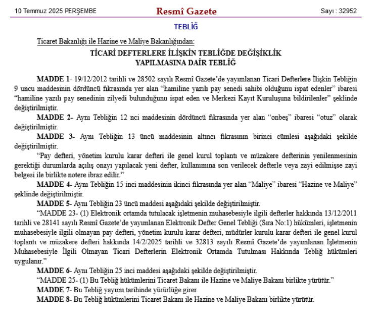 Değişiklikler, ticari defterlerin tutulması ve onay süreçlerini düzenleyen mevcut tebliğde önemli güncellemeler içeriyor.