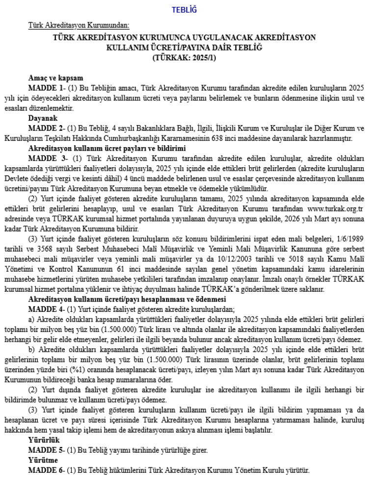 Türk Akreditasyon Kurumu (TÜRKAK), 2025 yılı için akredite kuruluşların ödeyeceği akreditasyon kullanım ücretlerini belirleyen tebliği yayımladı. Brüt geliri 1,5 milyon TL’yi aşan kuruluşlar, gelirlerinin yüzde 1’ini ödeyecek.