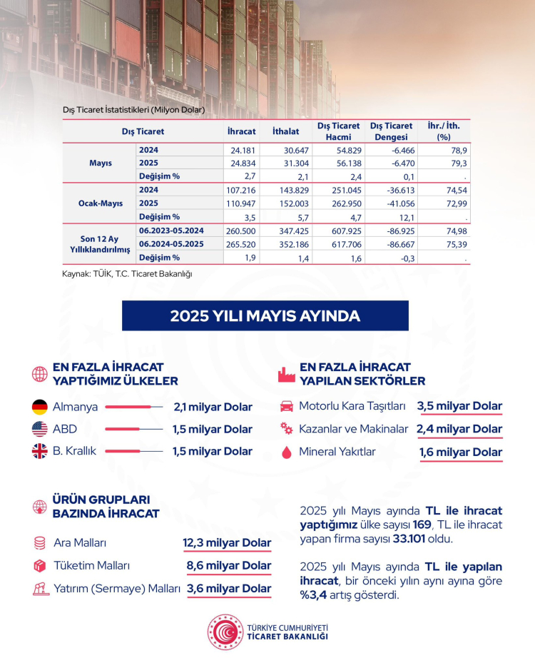 Ocak-Mayıs 2025 Döneminde ihracat yüzde 3,5 artışla 110,9 milyar dolar, ithalat ise yüzde 5,7 artışla 152 milyar dolar olurken, dış ticaret açığı yüzde 12,1 artışla 41,1 milyar dolar oldu.