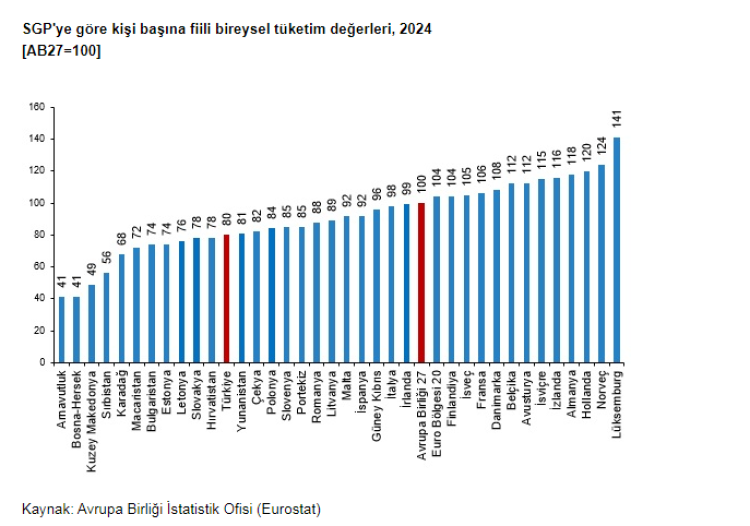 SGP karşılaştırmaları, 27 AB üyesi, 3 EFTA ülkesi (İsviçre, İzlanda, Norveç), 5 aday ülke (Türkiye, Kuzey Makedonya, Karadağ, Sırbistan, Arnavutluk) ve Bosna-Hersek’i kapsadı. Kişi başına GSYH endeksinde Lüksemburg 242 ile en yüksek, Bosna-Hersek 35 ile en düşük değere sahip oldu. Fiili bireysel tüketimde ise Lüksemburg 141 ile lider, Arnavutluk ve Bosna-Hersek 41 ile son sırada yer aldı.