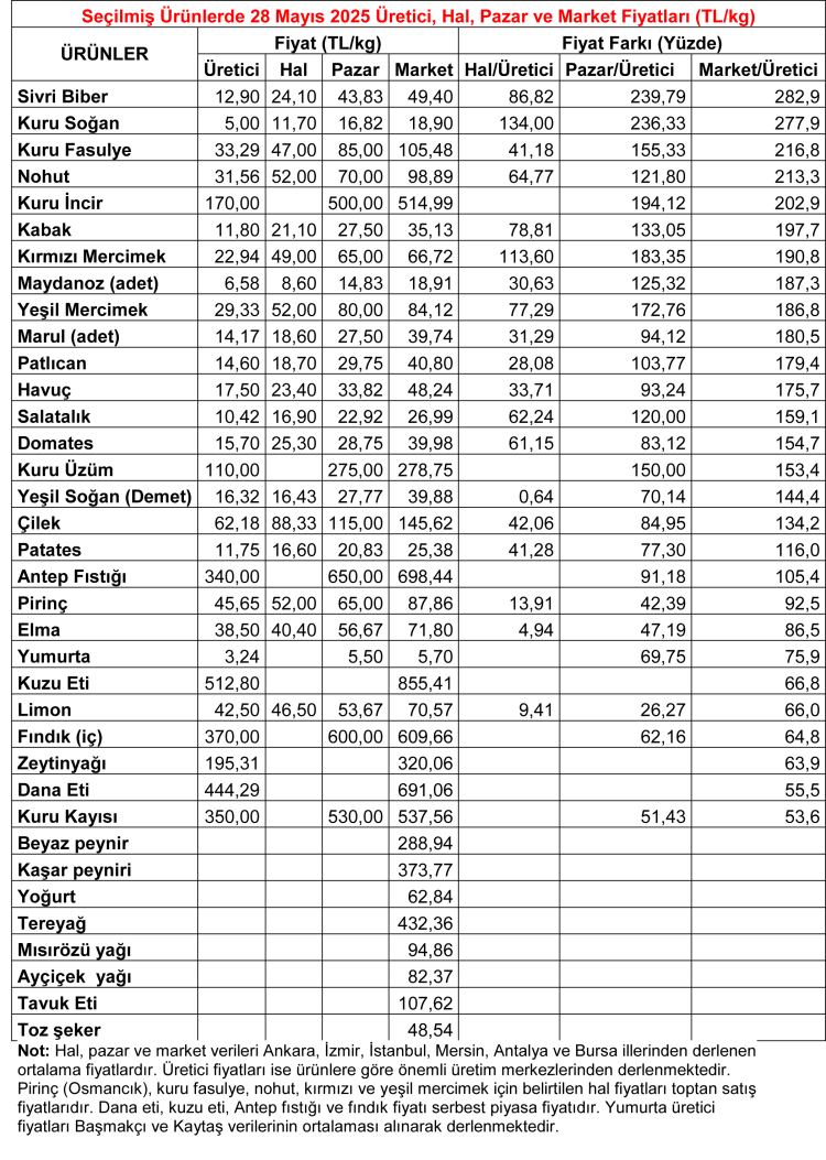 Mayıs’ta üretici ve market fiyatları arasındaki en büyük farkın yüzde 283 ile sivri biberde görüldüğünü belirten Bayraktar, "Bunu yüzde 278 ile kuru soğan, yüzde 217 ile kuru fasulye, yüzde 213 ile nohut ve yüzde 203 ile kuru incir izledi. Üreticide 13 TL olan sivri biber markette 49 TL’ye, 5 TL olan kuru soğan 19 TL’ye, 33 TL olan kuru fasulye 105 TL’ye satıldı" dedi