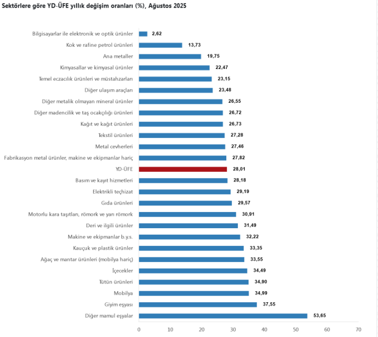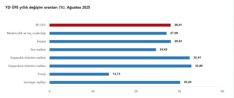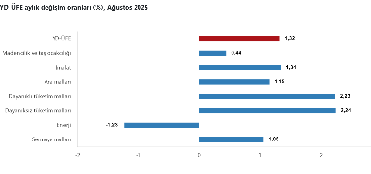 TÜİK, Ağustos 2025 Yurt Dışı Üretici Fiyat Endeksi'ni (YD-ÜFE) açıkladı. Endeks aylık yüzde 1,32, yıllık yüzde 28,01 artış gösterirken, imalat sektöründe yıllık değişim yüzde 28,03 olarak kaydedildi. Dayanıklı ve dayanıksız tüketim mallarının başı çektiği artışlarda, sektörel bazda en yüksek artış diğer mamul eşyalarda oldu.