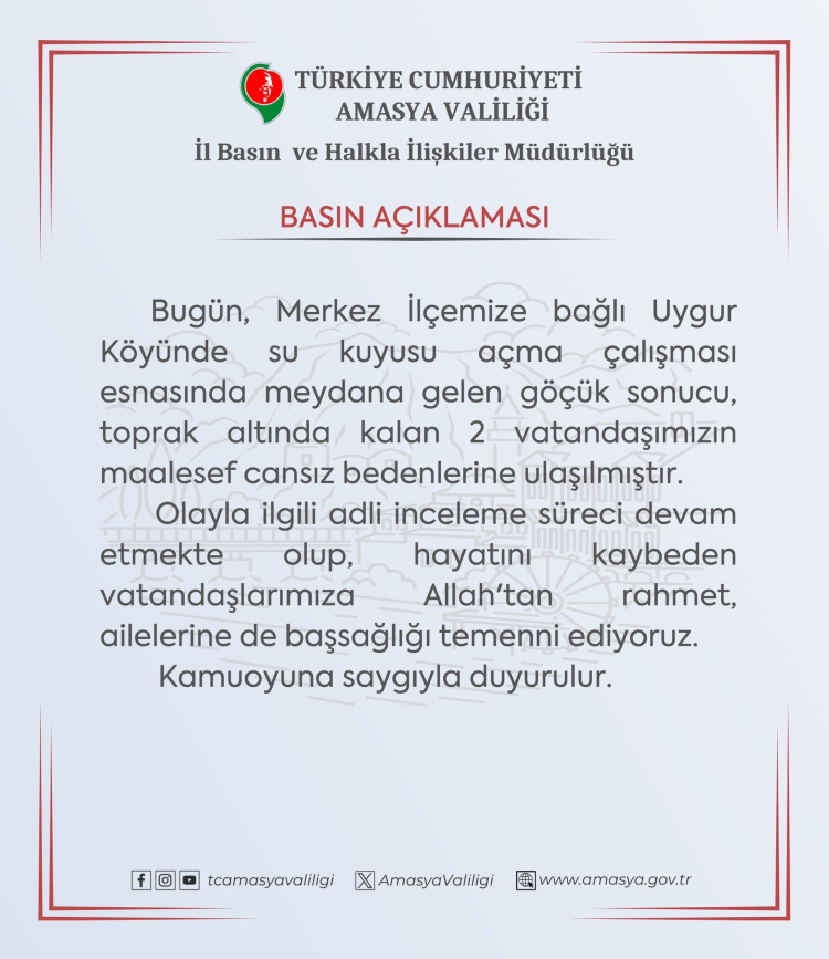 Amasya Valisi Önder Bakan, yazılı yaptığı açıklamada, olayla ilgili adli inceleme sürecinin devam ettiğini belirterek, hayatını kaybeden vatandaşlara Allah'tan rahmet, ailelerine de başsağlığı dileklerini iletti.