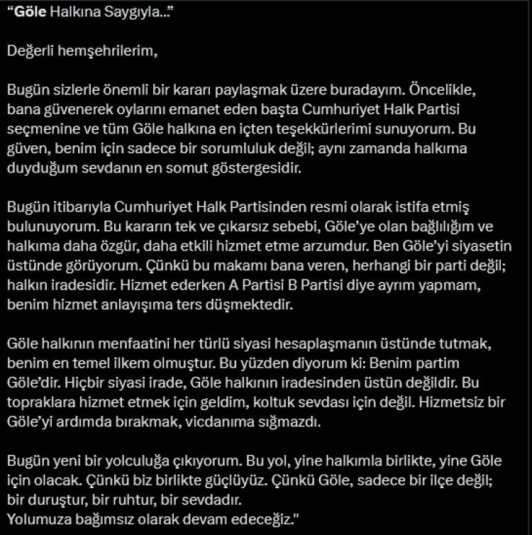 “Bana güvenerek oylarını emanet eden başta CHP seçmenine ve tüm Göle halkına teşekkürlerimi sunuyorum" diyen Başkan Budak, açıklamasında, "Bu güven, benim için sadece bir sorumluluk değil, halkıma duyduğum sevdanın en somut göstergesidir. Bugün itibarıyla CHP’den resmi olarak istifa etmiş bulunuyorum. Bu kararın tek sebebi, Göle’ye olan bağlılığım ve halkıma daha özgür, daha etkili hizmet etme arzumdur. Göle’yi siyasetin üstünde görüyorum. Çünkü bu makamı bana veren bir parti değil, halkın iradesidir.” ifadelerine yer verdi.