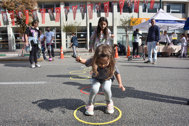Ulucami ile Valilik Binası arasında yapılan programda, bisiklet ve e-skuter sürüş eğitimlerinin yanı sıra 4 farklı alanda gazoz kapağı, cilli, yılan, ip atlama, yakar top, don ateş, istop, kuyruk kapmaca, mendil kapmaca, yağ satarım bal satarım, kutu kutu pense, körebe, davul zurna gibi sokak oyunları oynandı. Araba sesleri ile değil, çocuk gülüşleri ile dolan Heykel’de Bursalılar eğlence dolu bir gün geçirdi.