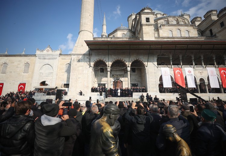 Osmanlı Padişahı 3. Murad'ın eşi Safiye Sultan tarafından başlatılan, Eminönü'ndeki Yeni Cami inşaatının 1665'te Sultan 4. Mehmed'in annesi Hatice Turhan Sultan tarafından tamamlandığını aktaran Cumhurbaşkanı Erdoğan, yaklaşık 358 yıldır milyonlarca kişinin uğrak yeri olan Yeni Cami'nin restorasyonu 2016 yılında başlatıldığına dikkati çekerek, "Bu kapsamda caminin saçak ve kubbelerindeki 175 ton kurşun değiştirilmiştir. Dış cephesi tamamıyla temizlenmiştir. Beden ve revak duvarları güçlendirilmiştir. Özgün malzemelerle yapılamayan içlik ve dışlıklar da aslına uygun şekilde değiştirilmiştir. Mermer söve, silme, alem ve korkuluklarındaki bozulmalar ve hasarlar giderilmiştir. Tarihi çinilerden kötü durumda olanlar sökülerek sağlamlaştırılmış, çatlak veya parça kaybı olanlar kalem işleriyle tamamlanmıştır. Revak kubbelerindeki kalem işleri restorasyon projesine göre tekrar yapılmıştır" diye konuştu.