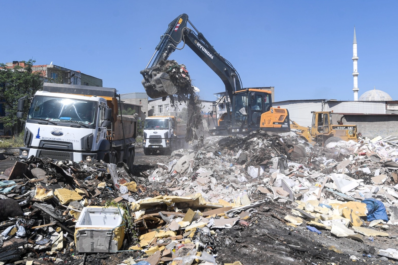 İzmir Büyükşehir Belediyesi ekipleri Buca’nın Seyhan Mahallesi’nde yer alan Milli Emlak Genel Müdürlüğü’ne ait boş alana kaçak dökülen yaklaşık bin 100 tonluk (55 kamyon) atığı topladı.