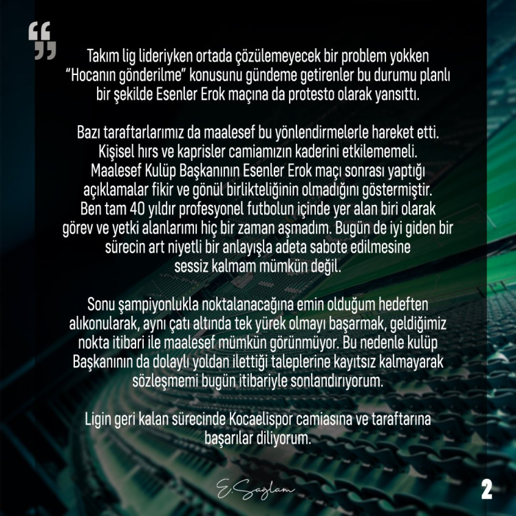 Trenyol 1. Lig'de başarılı bir dönem geçiren ve 16 maçta topladığı 32 puanla 2. sırada bulunan Kocaelispor'da teknik direktör Ertuğrul Sağlam, görevinden istifa ettiğini açıkladı.