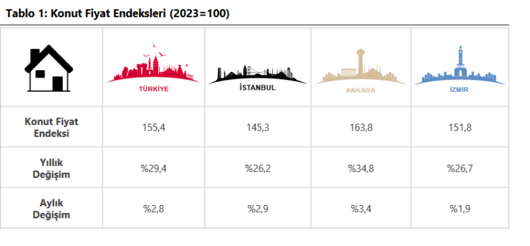 İstanbul, Ankara ve İzmir’in konut fiyat endekslerindeki gelişmeler değerlendirildiğinde, 2024 yılı Kasım ayında bir önceki aya göre, sırasıyla yüzde 2,9, 3,4 ve 1,9 oranlarında artış gözlendi. Endeks değerleri bir önceki yılın aynı ayına göre, İstanbul, Ankara ve İzmir’de sırasıyla yüzde 26,2, 34,8 ve 26,7 oranlarında artış gösterdi.