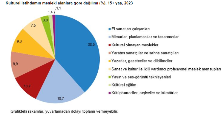 Kültürel istihdamın yüzde 89,3'ünü kültürel meslek alanlarında, yüzde 10,7'sini ise kültürel olmayan meslek alanlarında çalışanlar oluşturdu. Kültürel istihdamda olanların yüzde 38,5'ini el sanatları çalışanları, yüzde 18,7'sini mimarlar, planlamacı ve tasarımcılar, yüzde 9,9'unu yaratıcı sanatçılar ve sahne sanatçıları, yüzde 9,3'ünü ise yazarlar, gazeteciler ve dilbilimciler oluşturdu.