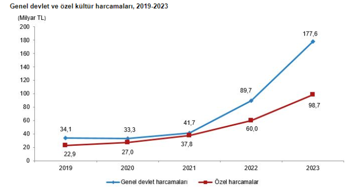 2023 yılında toplam kültür harcamaları içinde genel devlet harcamalarının payı yüzde 64,3 oldu. Genel devlet kültür harcamaları önceki yıla göre yüzde 98,1 artarak 177 milyar 594 milyon 791 bin TL olurken, harcamaların yüzde 67,9'u merkezi devlet bütçesinden gerçekleşti. Genel devlet kültür harcamalarında en yüksek pay yüzde 24,4 ile mimarlık alanında oldu.