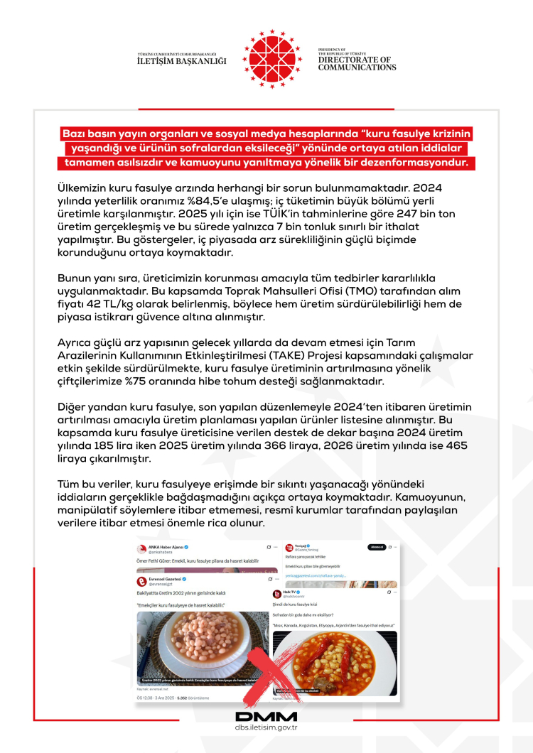 İletişim Başkanlığı Dezenformasyonla Mücadele Merkezi (DMM), bazı medya organlarında yer alan “kuru fasulyenin sofralardan eksileceği” yönündeki haberlerin gerçeği yansıtmadığını duyurdu.