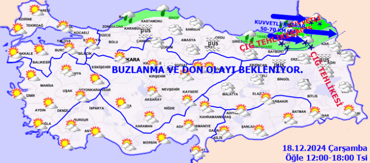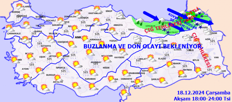 Yağışların; Rize ve Artvin kıyılarında kuvvetli yağmur ve sağanak, Ardahan ile Rize ve Artvin'in iç ve yüksek kesimlerinde yoğun kar yağışı şeklinde etkili olması bekleniyor. Rüzgarın Doğu Karadeniz kıyıları ile Ardahan çevrelerinde kuzeybatı, Doğu Karadeniz'in iç kesimlerinde batı ve güneybatı yönlerden kuvvetli ve kısa süreli fırtına(50-70 km/saat) şeklinde eseceği tahmin ediliyor. Bu sabah ve gece saatlerinde İç ve doğu kesimlerde buzlanma ve don ile birlikte pus ve yer yer sis bekleniyor. Doğu Karadeniz'in iç kesimlerinin yüksekleri ile Doğu Anadolu'nun yükseklerinin dik ve eğimli yamaçlarında çığ tehlikesi bulunmaktadır.