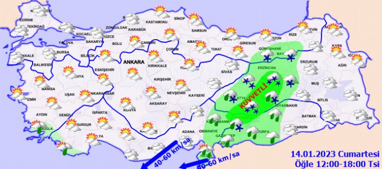 Parçalı ve çok bulutlu, Malatya, Elazığ, Tunceli, Erzincan ve Bingöl çevrelerinin kar yağışlı geçeceği tahmin ediliyor. Elazığ ve Tunceli çevrelerinde yağışların yer yer kuvvetli ve yoğun olması bekleniyor.