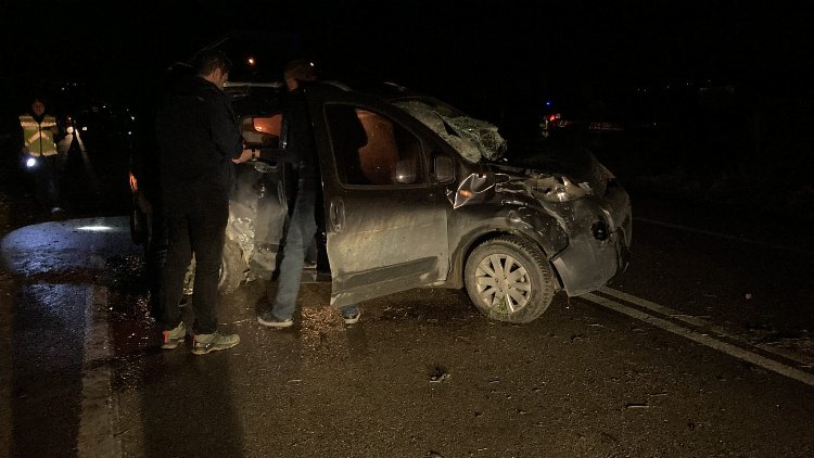 Hafif ticari araç çarpmanın şiddeti ile önce yol kenarındaki bahçe kapısına çarpan araç, daha sonra dönerek yine yola geri geldi.