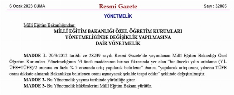 ANKARA (İGFA) - Resmi Gazete'de yayınlanan değişikliğe göre; özel okulların ara sınıflarının eğitim ücreti bir önceki eğitim öğretim yılında ilan edilen, okulda devam eden öğrencilerin ücreti ise öğrenci kayıt sözleşmesinde belirlenen eğitim ücretine; yılsonu TÜFE oranı dikkate alınarak Bakanlıkça belirlenen oranı aşmayacak şekilde tespit edilecek.