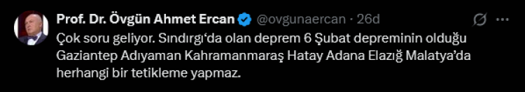 Balıkesir’in Sındırgı ilçesinde meydana gelen 6.1 büyüklüğündeki depremin ardından Jeofizik Yüksek Mühendisi Prof. Dr. Övgün Ahmet Ercan, Halk TV ve Sözcü TV yayınlarında yaptığı değerlendirmelerde ve sosyal medya paylaşımında, depremle ilgili dikkat çeken açıklamalarda bulundu.
