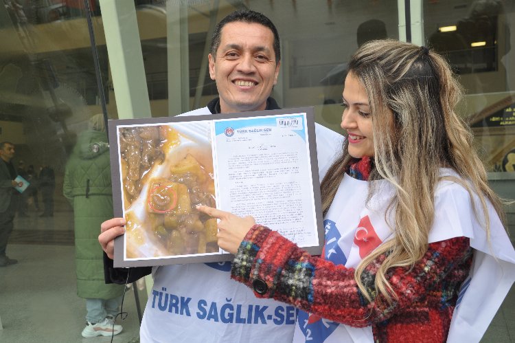Sağlık çalışanları için üretilen yemeklerde sürekli yabancı cisimler çıkmasına çalışanlar ve Türk Sağlık Sen üyeleri tepki gösterdi.