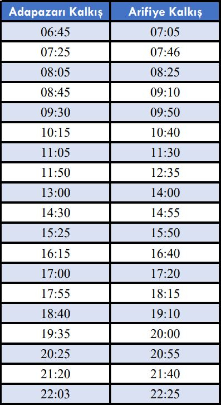 8 yıl aradan sonra yeniden Adapazarı-Arifiye arasında hizmete başlayan ADARAY’ın sefer saatleri ve sayısında güncellemeye gidildiğine dikkat çekilen açıklamada, "Adapazarı-Gebze arasında hizmet veren Ada Treni’yle entegre olacak şekilde yeniden düzenlenen ADARAY, 15 Aralık Pazar gününden itibaren yeni sefer saatlerinde çalışacaktır. Buna göre ADARAY, 19 gidiş ve 19 geliş olmak üzere günde 38 sefer yolcu taşıyacaktır. Tüm vatandaşlarımızın yenilenen sefer saatlerini dikkate almalarını önemle rica ederiz” ifadeleri yer aldı.