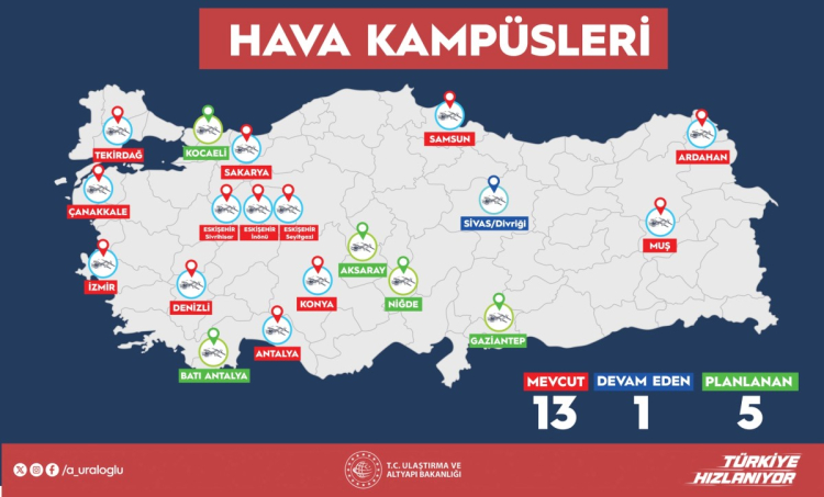 Uraloğlu ayrıca, sadece helikopter inişi yapılabilen hava kampüslerin ise Muş, Denizli, İzmir Aliağa, Eskişehir Seyitgazi ile Ardahan’da bulunduğunu dile getirdi.