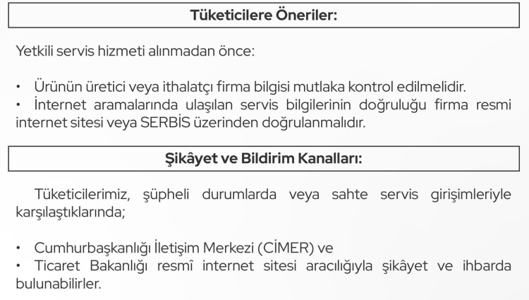 Sahte servislerle mücadele kapsamında denetimlerini sürdüreceğini ve gerekli idari yaptırımların uygulanacağını vurgulayan Bakanlık, vatandaşlara yetkili servis hizmeti almadan önce ürünün üretici veya ithalatçı firma bilgilerini kontrol etmeleri ve www.servis.gov.tr adresini kullanmaları çağrısında bulundu.