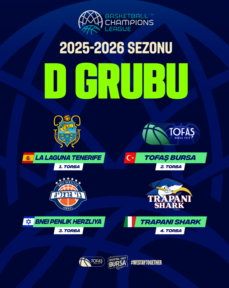 Basketbol Şampiyonlar Ligi’nde 2025-2026 sezonu kuraları çekildi. Kuraya 2. torbadan katılan TOFAŞ, normal sezonda İspanya’dan La Laguna Tenerife, İsrail’den Bnei Penlink Herzliya ve İtalya’dan Trapani Shark ile D Grubu’nda eşleşti.