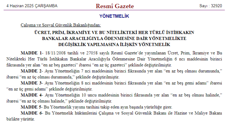 Çalışma ve Sosyal Güvenlik Bakanlığı, ücret, prim, ikramiye ve benzeri ödemelerin bankalar aracılığıyla yapılmasına dair yönetmelikte değişiklik yaptı. İşçi, gazeteci ve gemi adamı sayısında “en az 5” şartı “en az 3” olarak düşürüldü. Yeni düzenleme, 1 Temmuz 2025'te yürürlüğe girecek.