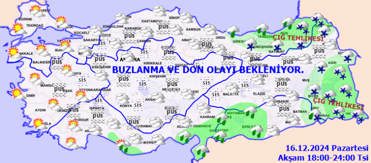 Kıyı kesimlerde sağanak, iç kesimlerde yağmur ve karla karışık yağmur, iç kesimlerin yükseklerinde kar olarak görülmesi beklenen yağışların, Antalya'nın doğu kıyılarında yerel kuvvetli olacağı tahmin ediliyor. Ülkemizin iç ve doğu kesimlerinde buzlanma ve don ile birlikte pus ve yer yer sis görüleceği tahmin edilirken, Doğu Karadeniz’in iç kesimlerinin yüksekleri ile Doğu Anadolu’nun doğusunun dik ve eğimli yamaçlarında çığ tehlikesi bulunduğu bildirildi.
