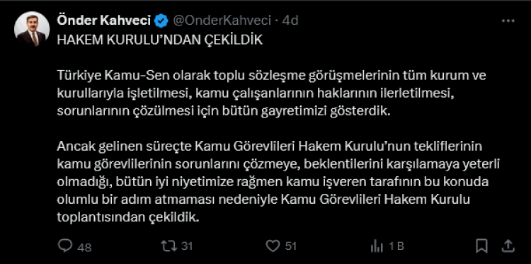 Kahveci, sosyal medya hesabından yaptığı paylaşımda, “Toplu sözleşme görüşmelerinin tüm kurum ve kurullarıyla işletilmesi için elimizden geleni yaptık. Ancak Kamu Görevlileri Hakem Kurulu’nun teklifleri, kamu çalışanlarının sorunlarını çözmeye ve beklentilerini karşılamaya yeterli değil. Kamu işveren tarafının olumlu bir adım atmaması nedeniyle toplantıdan çekildik” ifadelerini kullandı.