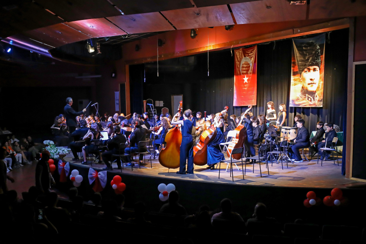 İZMİR (İGFA) - İzmir'de Narlıdere Belediyesi, İstiklal Mücadelemizin en büyük eseri ve milletimizin bağımsızlık aşkının en somut göstergesi şanlı Cumhuriyetimizin 102’nci yılını muhteşem bir konserle taçlandırdı. Narlıdere Belediyesi Çocuk Senfoni Orkestrası, Şef Tolga Akın yönetiminde Narlıdere Atatürk Kültür Merkezi’nde verdiği ‘Cumhuriyet Konseri’ ile sanatseverlere unutulmaz bir gece yaşattı.