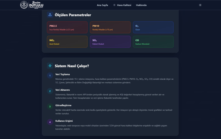 Büyükşehir Belediyesi’nin yen bir uygulamayı daha vatandaşların hizmetine sunduğunu söyleyen Manisa Büyükşehir Belediye Başkanı Besim Dutlulu, “Vatandaşlarımız artık evlerinden çıkmadan önce yalnızca hava sıcaklığını değil, aynı zamanda soludukları havanın kalitesini de kolaylıkla takip edebilecek. Böylece günlük yaşam planlamaları, açık hava etkinlikleri ve spor aktiviteleri çok daha bilinçli, sağlıklı ve güvenli bir şekilde yapılabilecek. Bu uygulama, hem halk sağlığına doğrudan katkı sağlayacak hem de kentimizde çevresel farkındalığın artmasına önemli ölçüde destek olacaktır. Emeği geçen tüm çalışma arkadaşlarımıza teşekkür ederim. Manisa'mız için hep birlikte çalışmaya, yenilikçi adımlar atmaya ve yaşam kalitesini yükselten projeleri hayata geçirmeye devam edeceğiz” dedi.