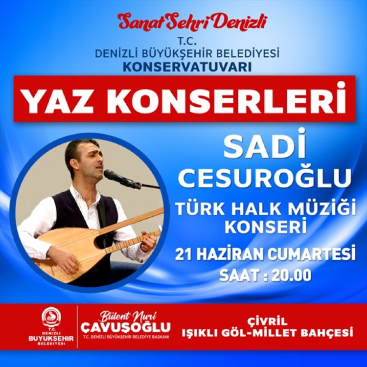 Sanat programlarının bir diğer ayağı ise Çivril’de gerçekleştirilecek. 21 Haziran Cumartesi günü saat 20.00’de, Çivril Işıklı Göl-Millet Bahçesi’nde gerçekleştirilecek konserde, Denizli Büyükşehir Belediyesi Konservatuvarı sanatçısı Sadi Cesuroğlu sahne alacak. Anadolu’nun dört bir yanından derlenen halk türküleri ile müzikseverlerin beğenisine sunulacak olan bu etkinlik, doğayla iç içe bir konser atmosferi yaşamak isteyen izleyicilere açık havada unutulmaz bir deneyim vaat ediyor. Hafta sonu düzenlenecek konserlere katılmak isteyen sanatseverler ise biletlerini e-bilet.denizli.bel.tr adresinden ücretsiz temin edebilecek.