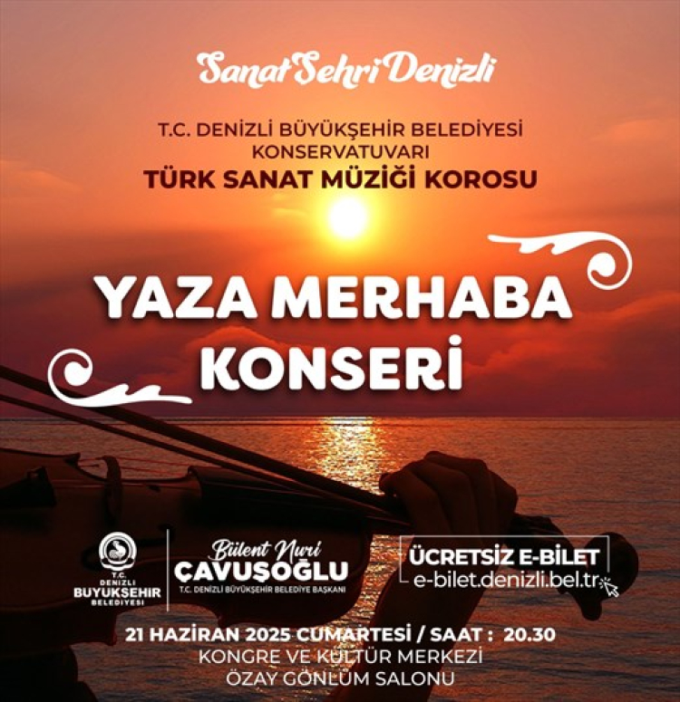 Etkinlikler, 21 Haziran Cumartesi akşamı saat 20.30’da gerçekleştirilecek “Yaza Merhaba Konseri” ile devam edecek. Denizli Büyükşehir Belediyesi Konservatuvarı Türk Sanat Müziği Korosu’nun sahne alacağı konser, Kongre ve Kültür Merkezi’nin Özay Gönlüm Salonu’nda düzenlenecek. Koro, klasik Türk sanat müziğinin seçkin eserlerinden oluşan repertuvarı ile izleyicilere nostaljik ve duygusal bir müzik şöleni sunacak. Yaz mevsiminin karşılanmasına özel olarak hazırlanan bu etkinlik, geleneksel müzik değerlerini yaşatacak.