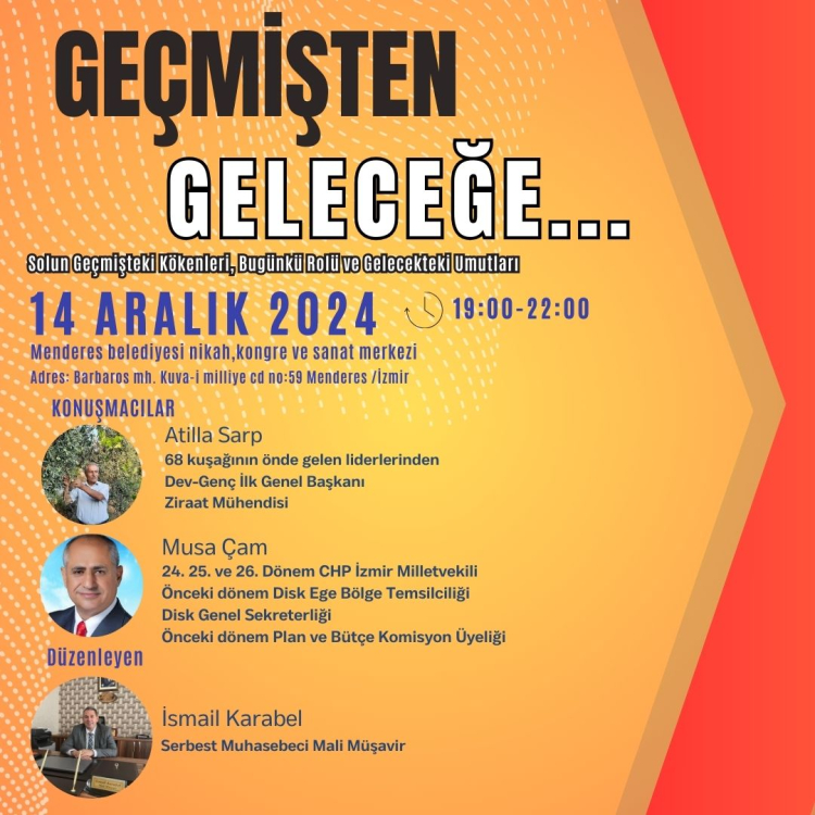 Etkinliğin düzenleyicisi Mali Müşavir İsmail Karabel üstlenirken, panelin konuşmacıları arasında dikkat çeken iki önemli isim yer alıyor. CHP İzmir Milletvekili Musa Çam ve Dev-Genç’in ilk genel başkanı Atilla Sarp, Türkiye’de sol düşüncenin tarihsel serüvenini, toplumsal değişimlerdeki etkisini ve gelecekteki olası yol haritasını masaya yatıracak.