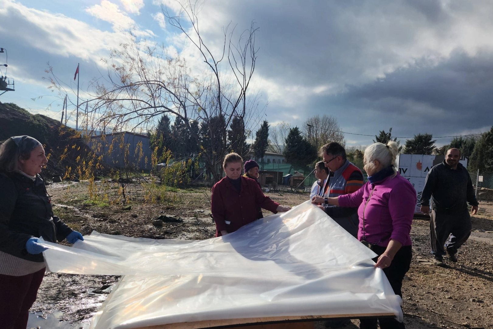 Köpeklerin kulübelerini tamir eden çalışma grubu üyeleri, yağmur ve soğuk hava şartlarından korumak için naylon çekerek onların korunmalarını sağlarken, mama desteğinde de bulundu.