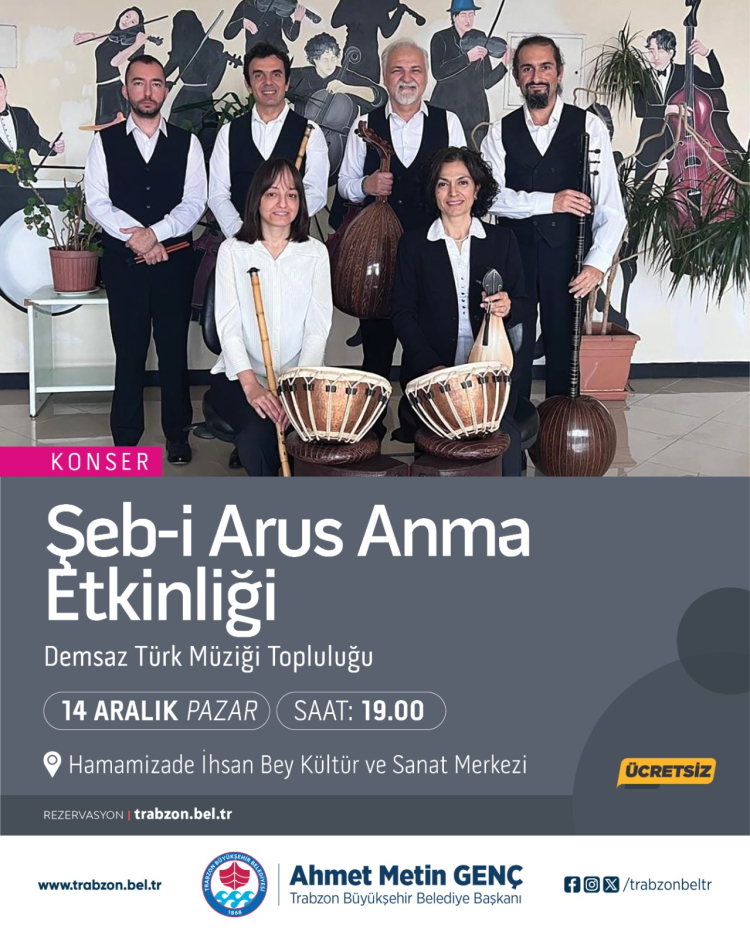 Konser programı 3 Aralık Çarşamba günü saat 19.00’da Trabzon Görme Engelliler Sanat Spor Kulübü’nün Türk Halk Müziği konseriyle başlayacak. 10 Aralık Çarşamba günü saat 19.00’da Trabzon Taka Müzik ve Halkoyunları Derneği, 14 Aralık Pazar günü saat 19.00’da Demsaz Türk Müziği Topluluğu, 15 Aralık Pazartesi saat 19.00’da Karadeniz Folklor ve Müzik Eğitimi Gençlik Derneği, 17 Aralık Çarşamba günü saat 19.00’da Erdal Şahin, 23 Aralık Salı günü saat 19.00’da Trabzon Liselerinden Yetişenler Derneği, 29 Aralık Pazartesi günü saat 19.00’da ise Trabzon Müzik ve Halkoyunları Derneği konser verecek.
